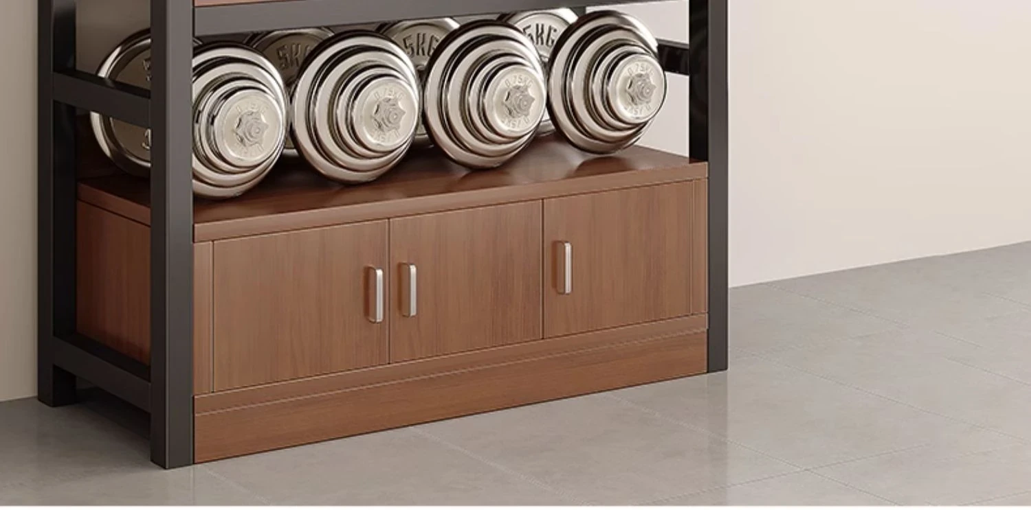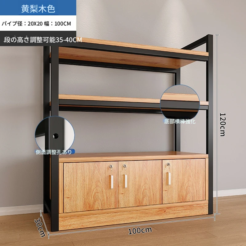 【35-40層高 ダブルボトム横棒】黄梨木+黒フレーム三層ラック120CM