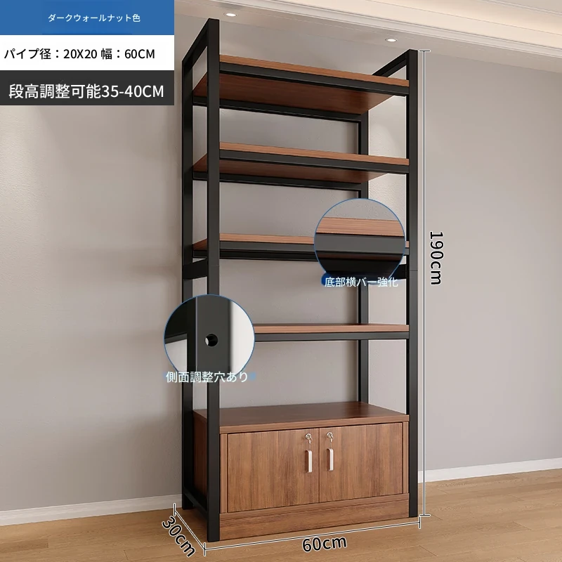 【35-40層高 ダブルボトム横棒】深胡桃+黒フレーム五層ラック60CM