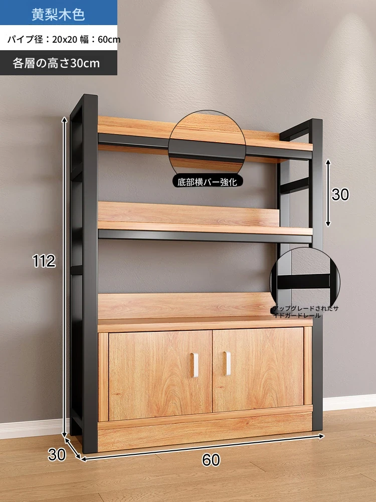【35-40層高 ダブルボトム横棒】黄梨木+黒フレーム四層ラック60CM
