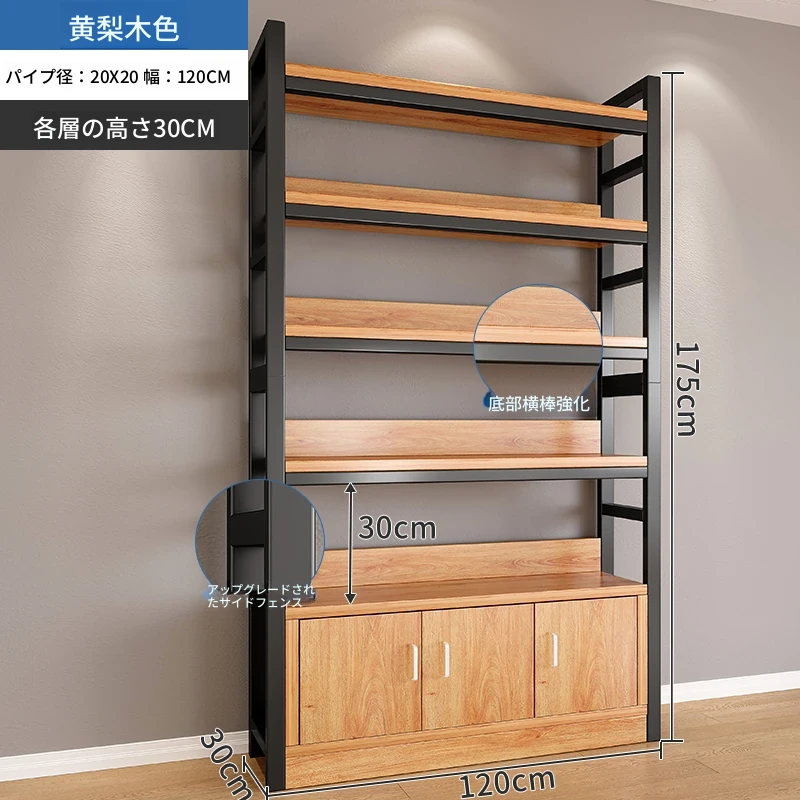【35-40層高 ダブルボトム横棒】黄梨木+黒フレーム五層ラック120CM