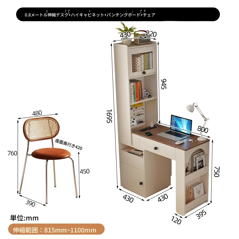 0.8メートル伸縮式デスク+ハイキャビネット+ペグボード+チェア【ENF級全多層無垢材+拡張可能なデスクトップ】