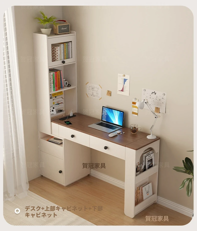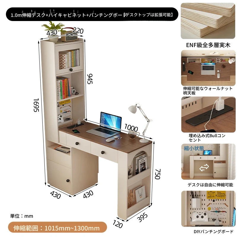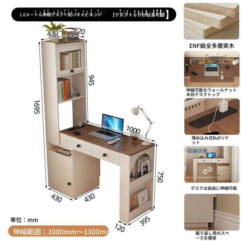 1.0メートル伸縮式デスク+ハイキャビネット【ENF級全多層無垢材+拡張可能なデスクトップ】