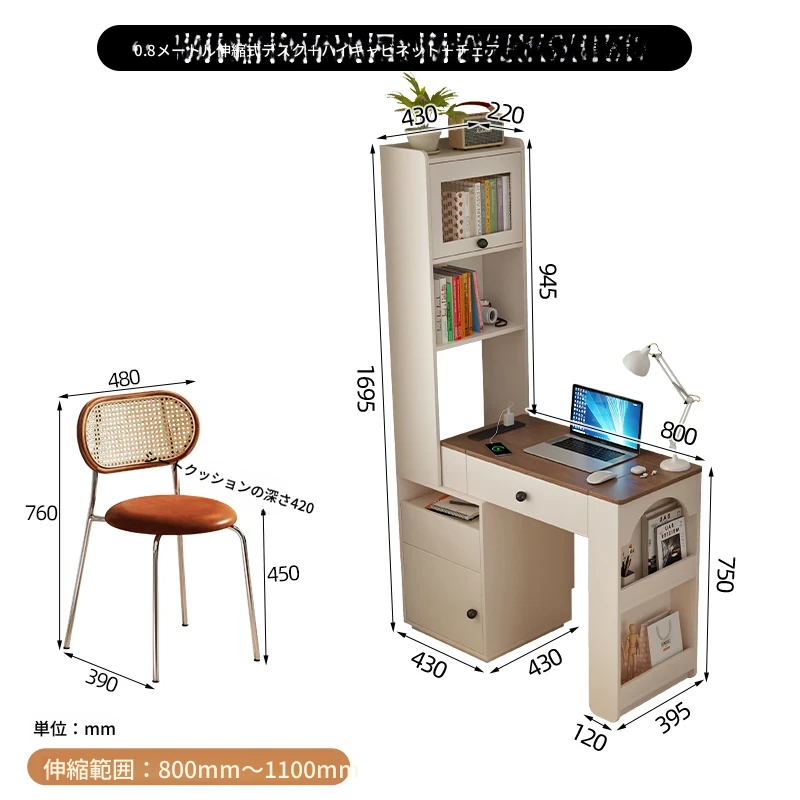 0.8メートル伸縮式デスク+ハイキャビネット+チェア【ENF級全多層無垢材+拡張可能なデスクトップ】
