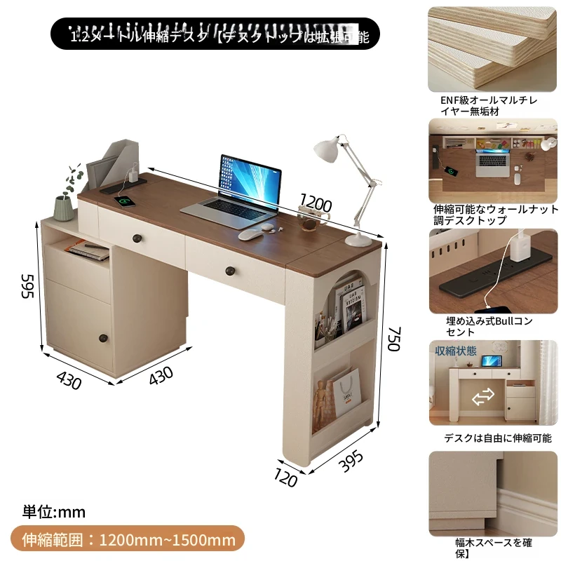 1.2メートル伸縮式デスク【ENF級全多層無垢材+拡張可能なデスクトップ】