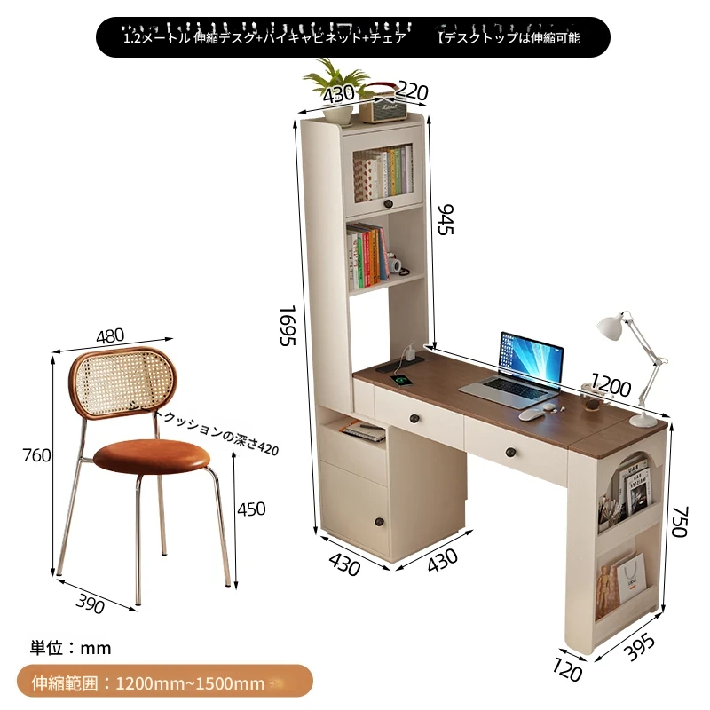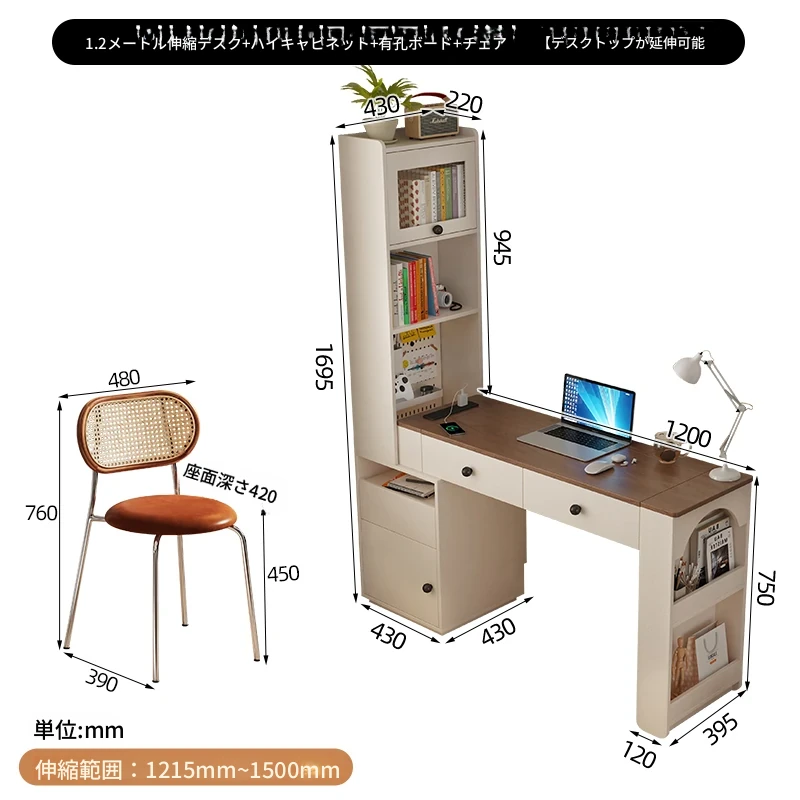 1.2メートル伸縮式デスク+ハイキャビネット+チェア【ENF級全多層無垢材+拡張可能なデスクトップ】