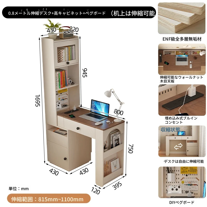 0.8メートル伸縮式デスク+ハイキャビネット+ペグボード【ENF級全多層無垢材+拡張可能なデスクトップ】