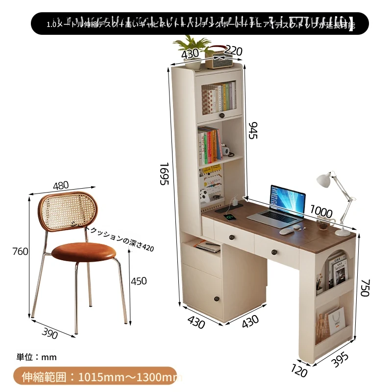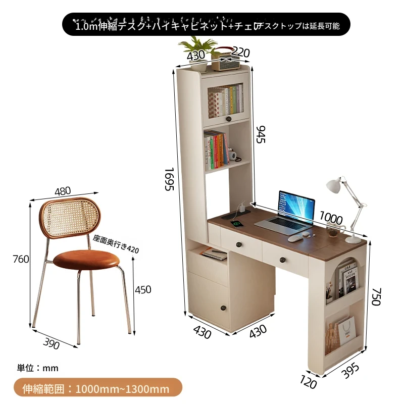 1.0メートル伸縮式デスク+ハイキャビネット+チェア【ENF級全多層無垢材+拡張可能なデスクトップ】