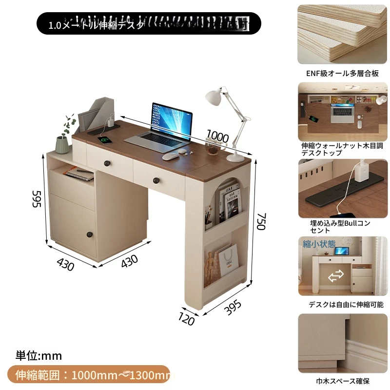 1.0メートル伸縮式デスク【ENF級全多層無垢材+拡張可能なデスクトップ】