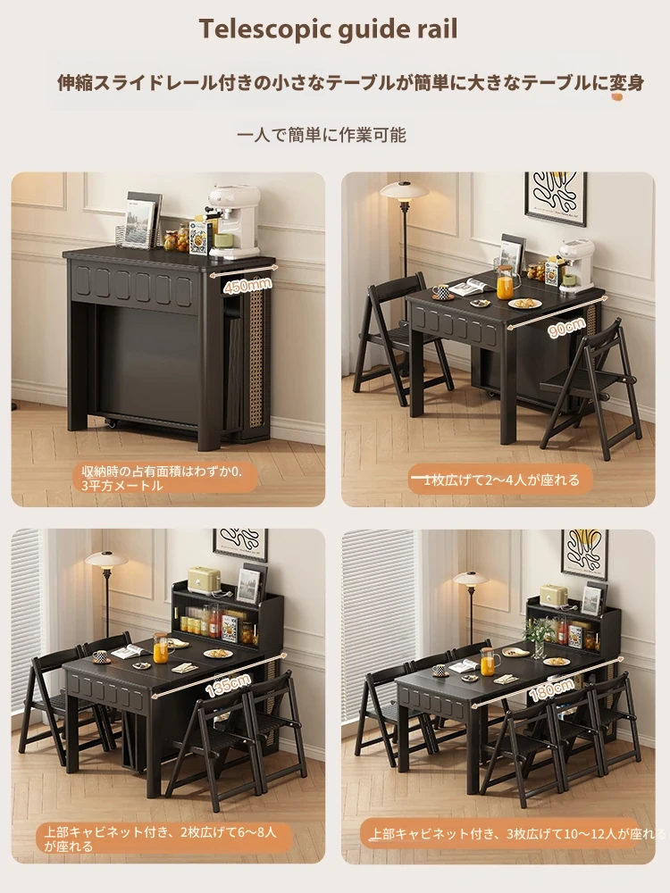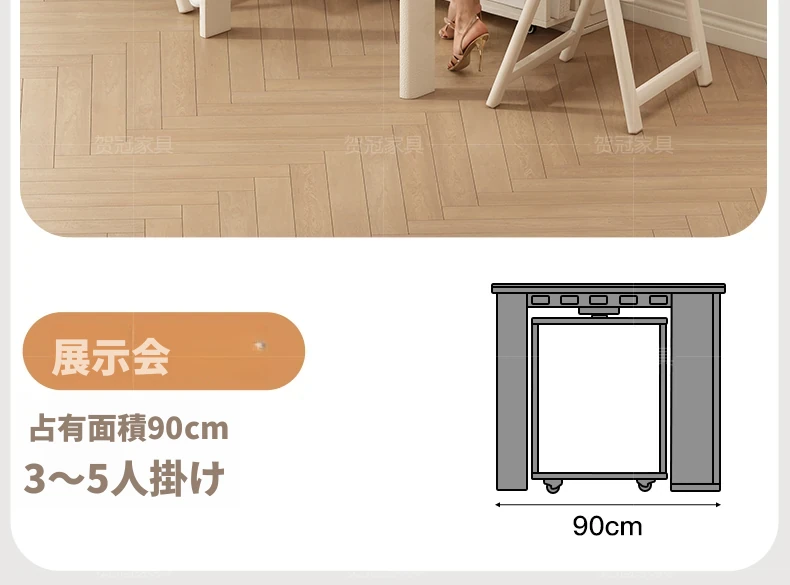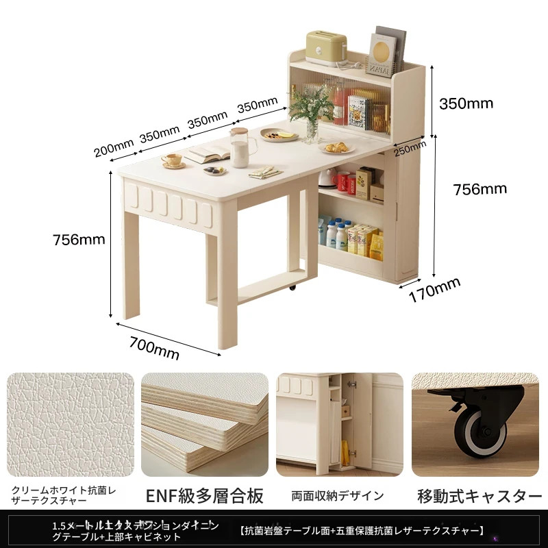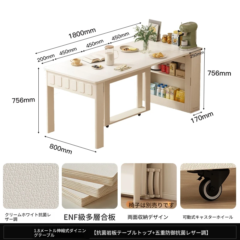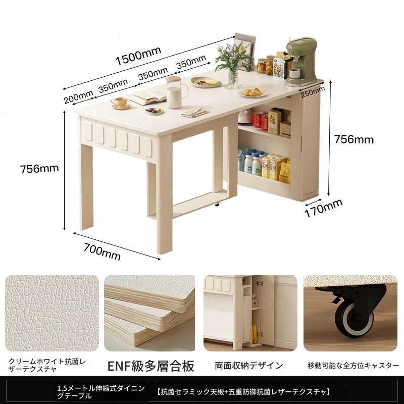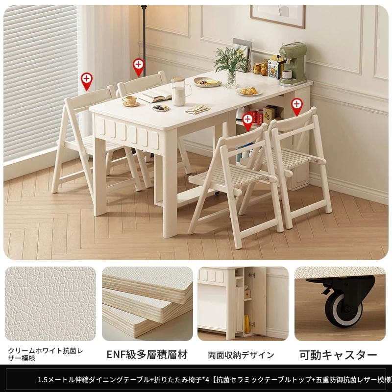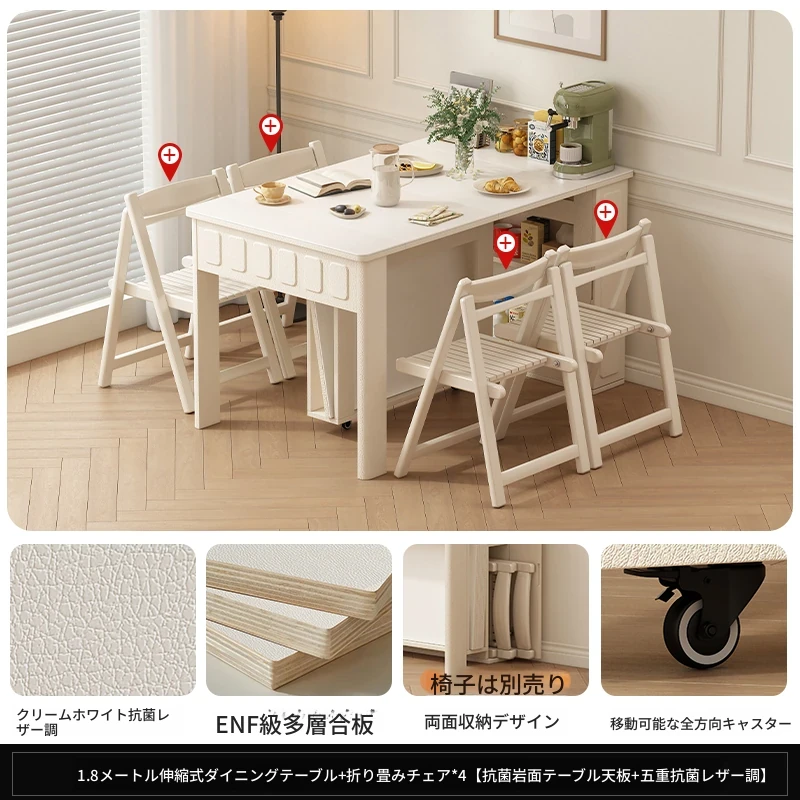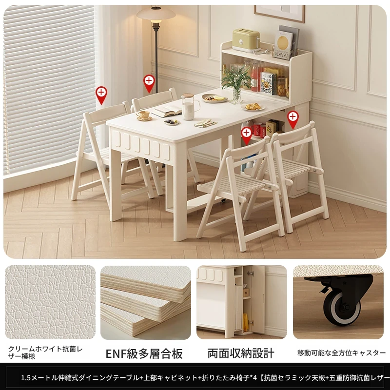 70*150cm+防塵キャビネット+折りたたみ椅子*4【レザー/隠せるダイニングチェア*2】