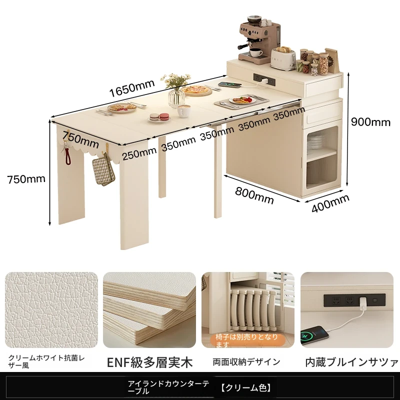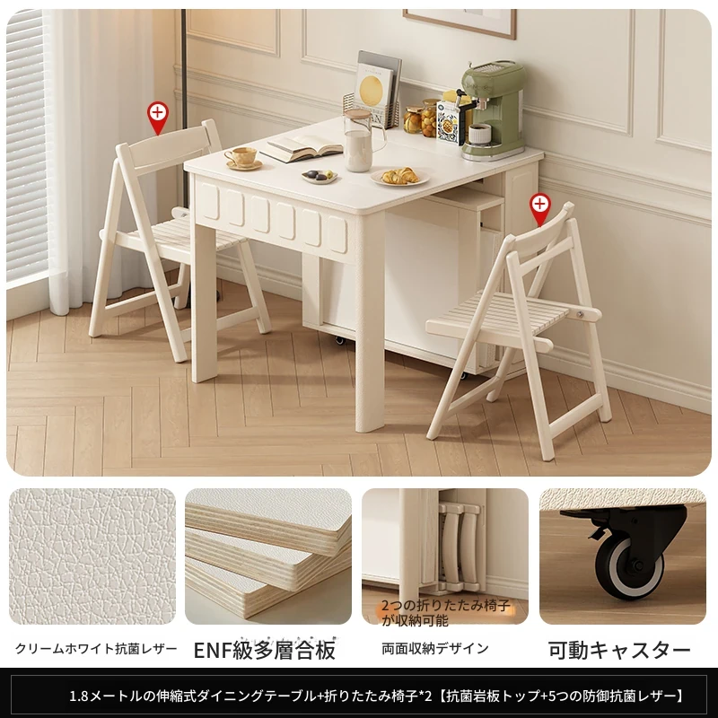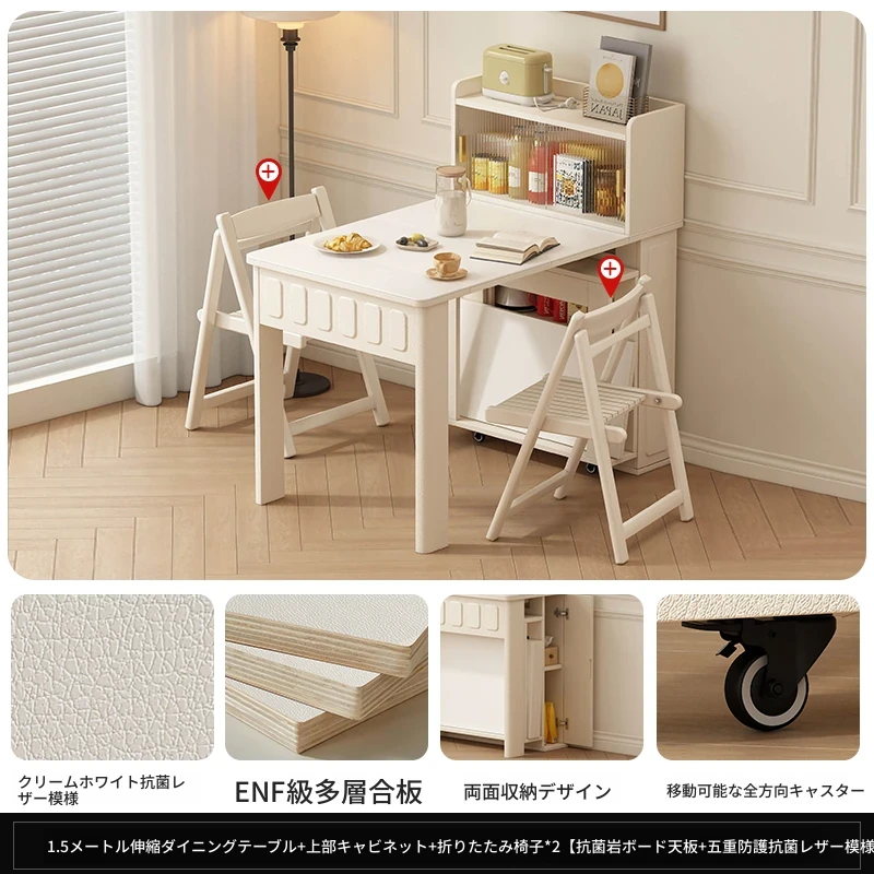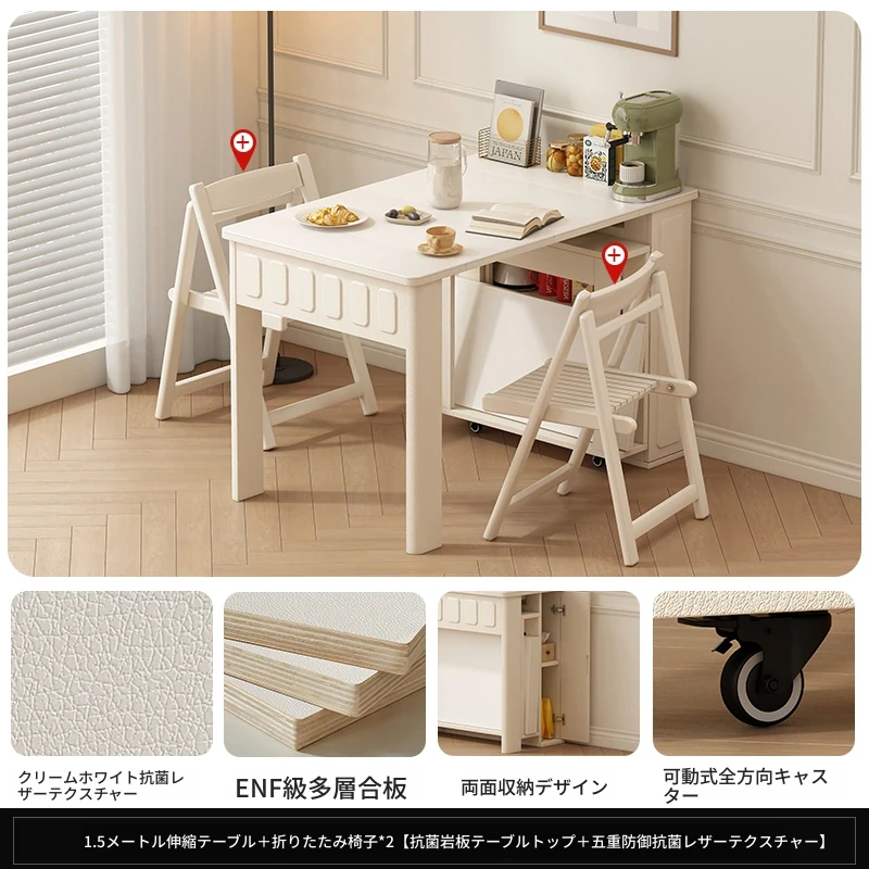 70*150cm+防塵キャビネット+折りたたみ椅子*2【レザー/隠せるダイニングチェア*2】