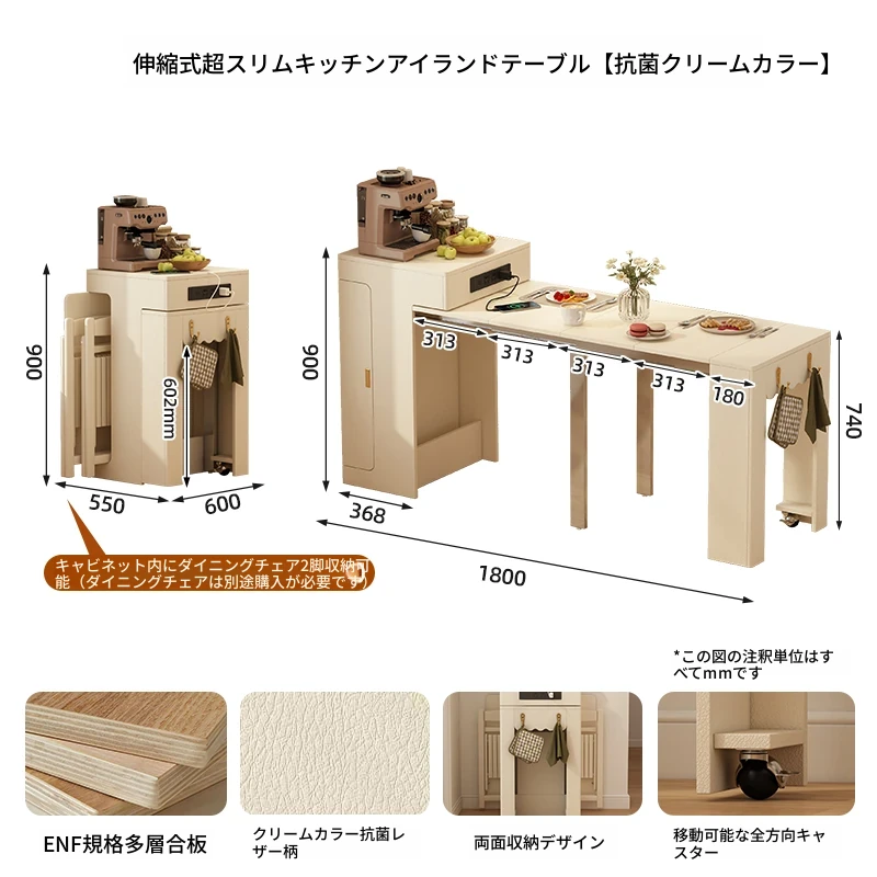 伸縮小型アイランドダイニングテーブル【幅60cm+レザーホワイト】