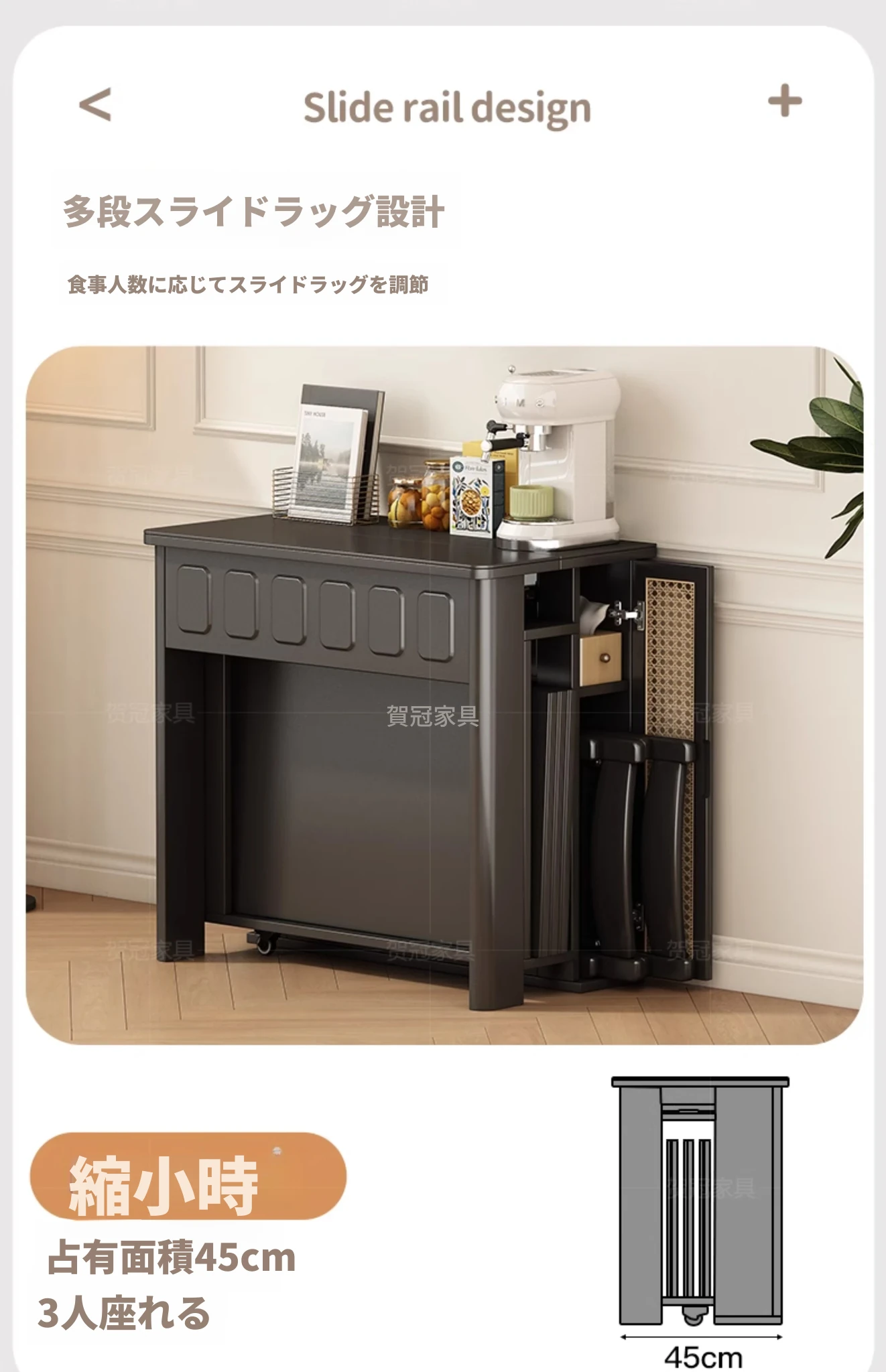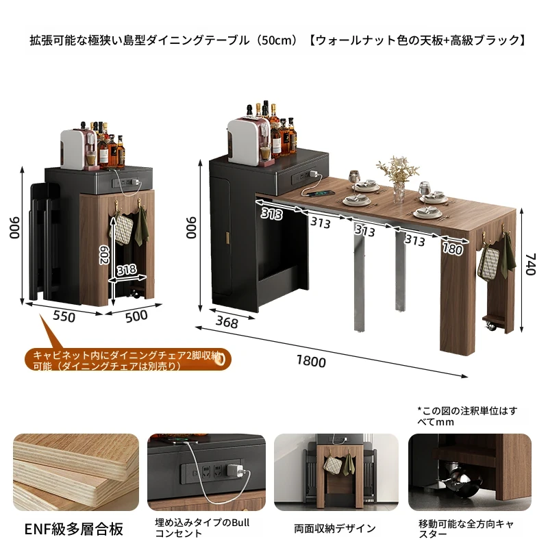 伸縮小型アイランドダイニングテーブル【幅50cm選択可+ウォールナット木目+高級ブラック】