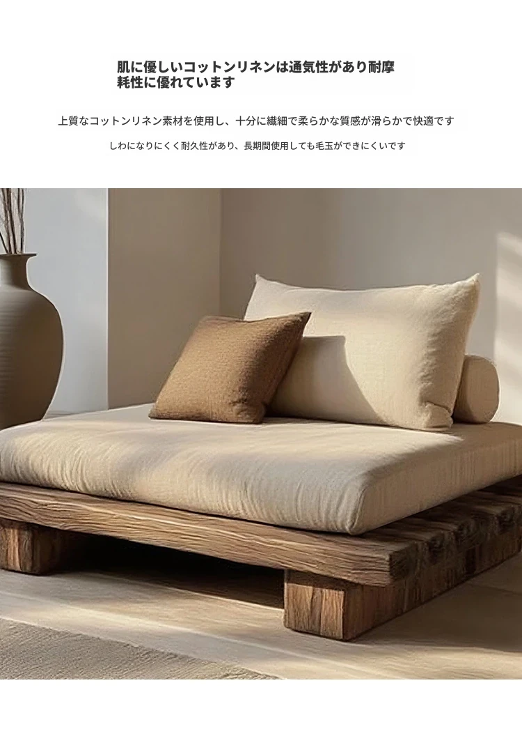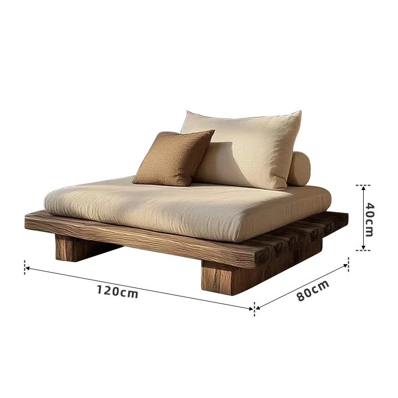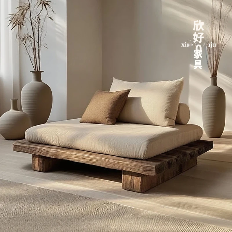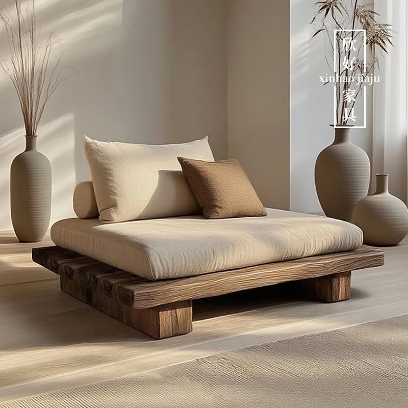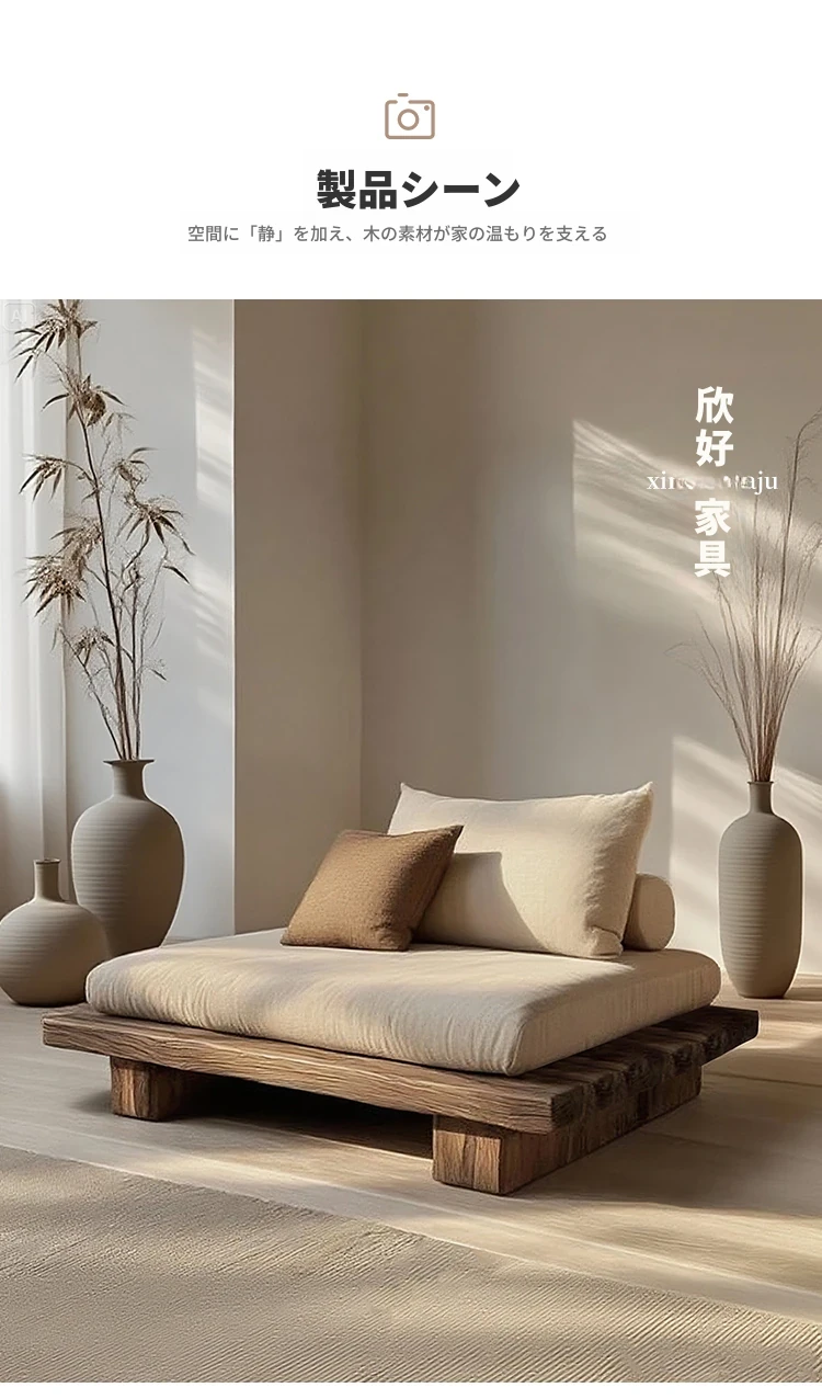 侘寂スタイルの全木製シングル&ダブルソファー - 和の心を感じる座禅用リラックスチェア。レトロな風合いで、民宿やホテルにぴったりのインテリア。心安らぐひとときをお楽しみください。