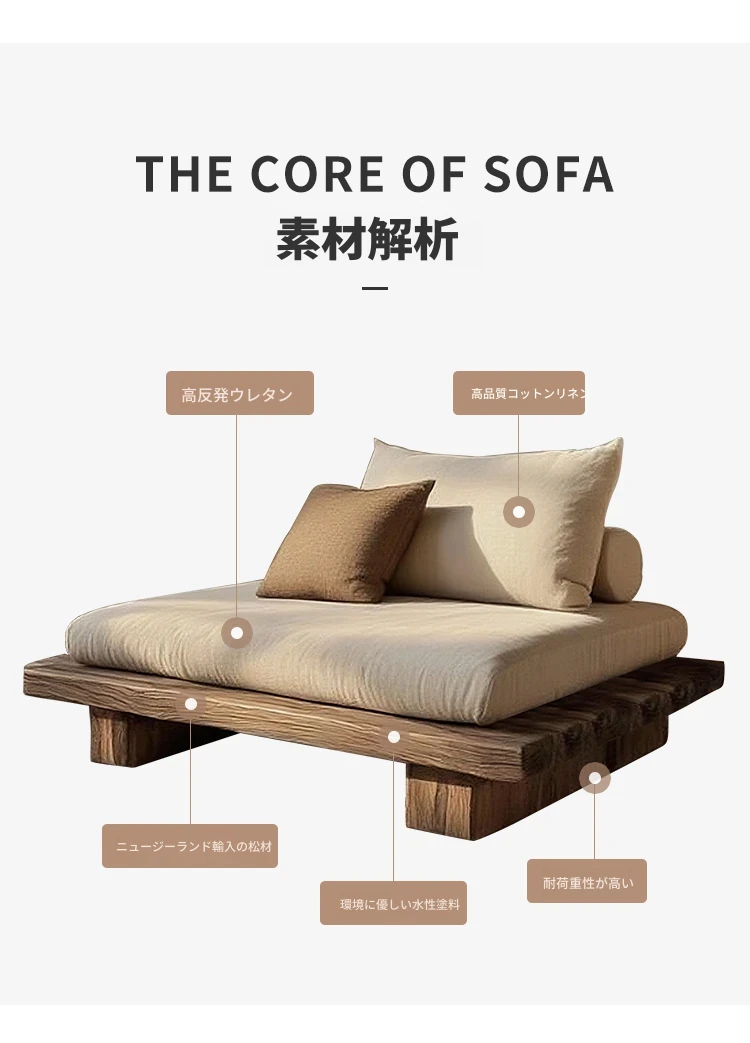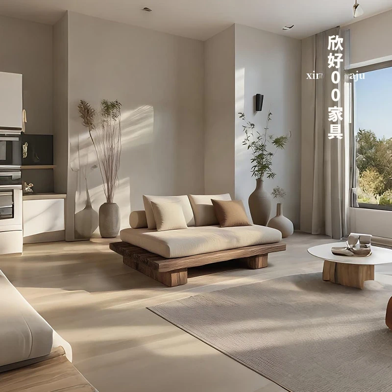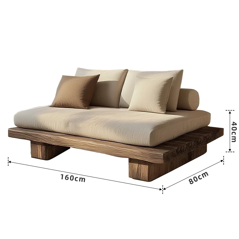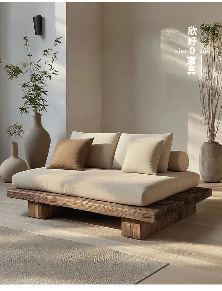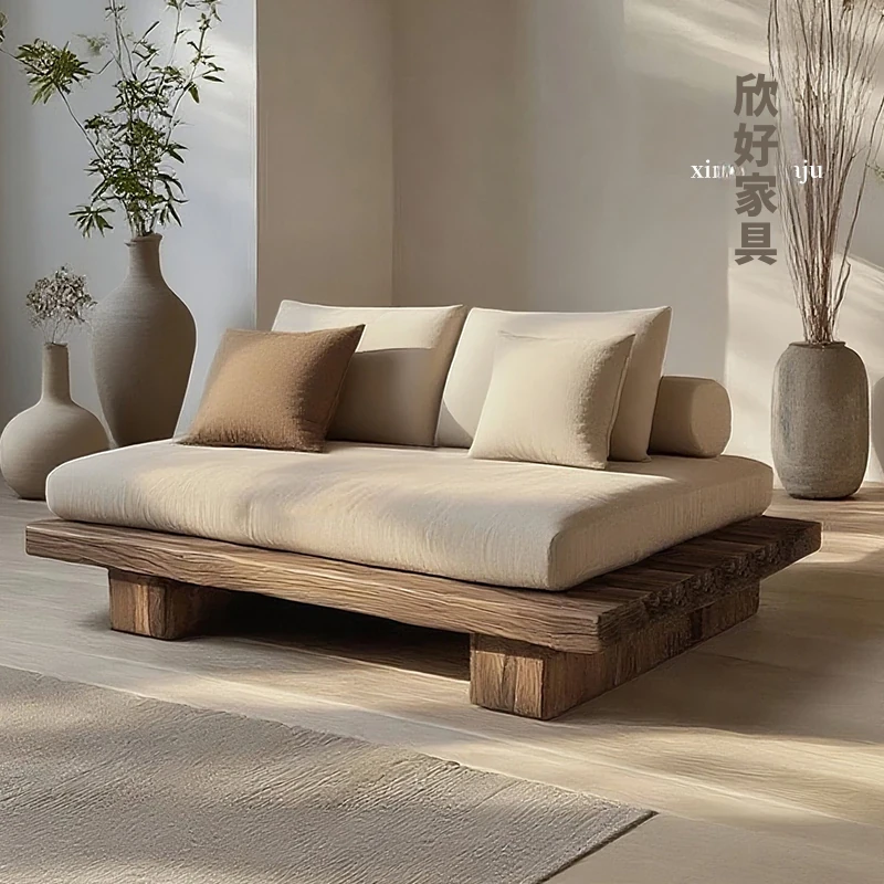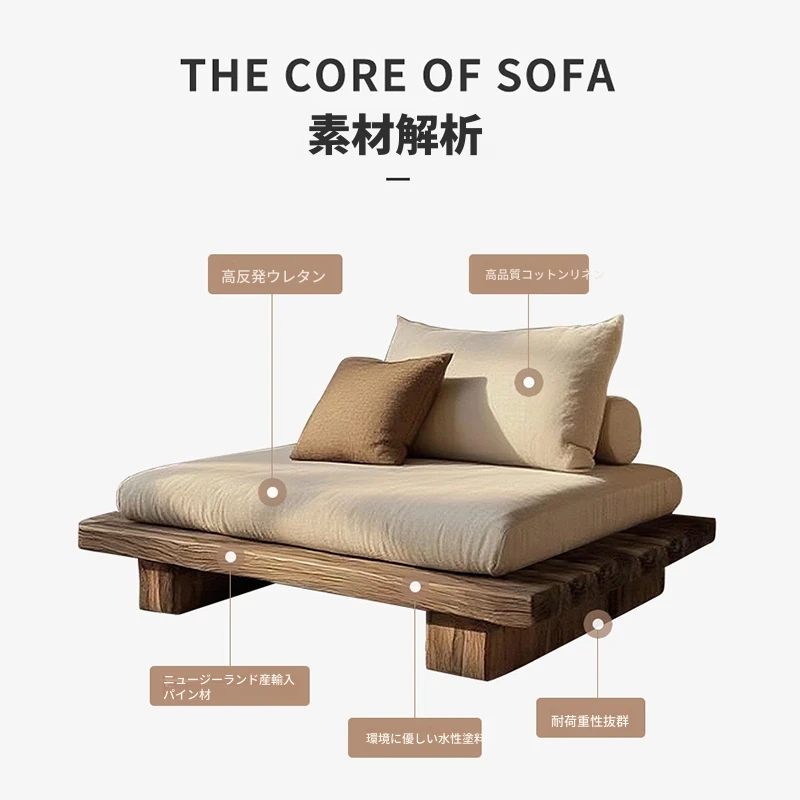 侘寂スタイルの全木製シングル&ダブルソファー - 和の心を感じる座禅用リラックスチェア。レトロな風合いで、民宿やホテルにぴったりのインテリア。心安らぐひとときをお楽しみください。
