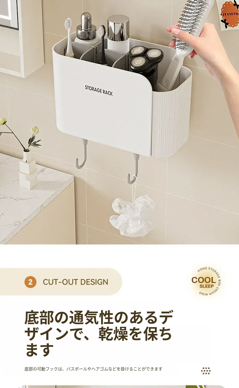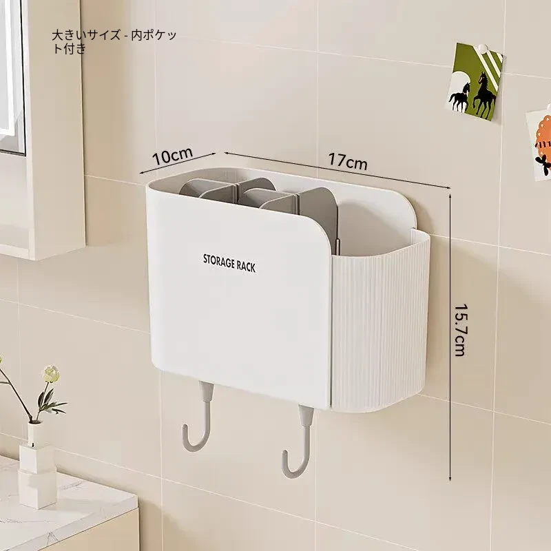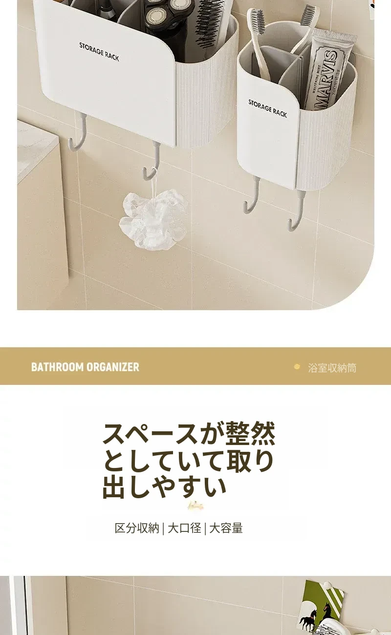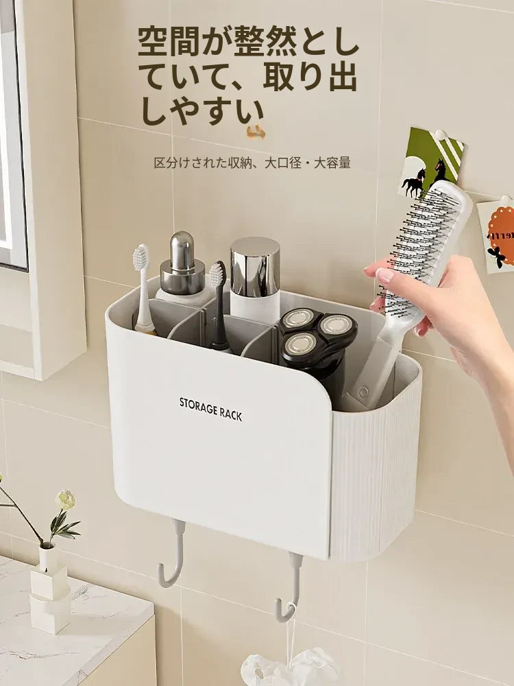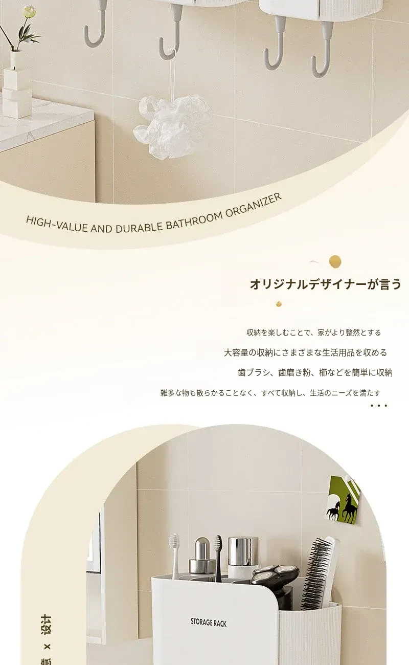 多機能壁掛けバスルーム収納棚 - シェーバーや洗面用具、歯ブラシ・歯磨き粉・櫛をすっきり整理!おしゃれで実用的な収納で、毎日の身支度がもっと楽に!