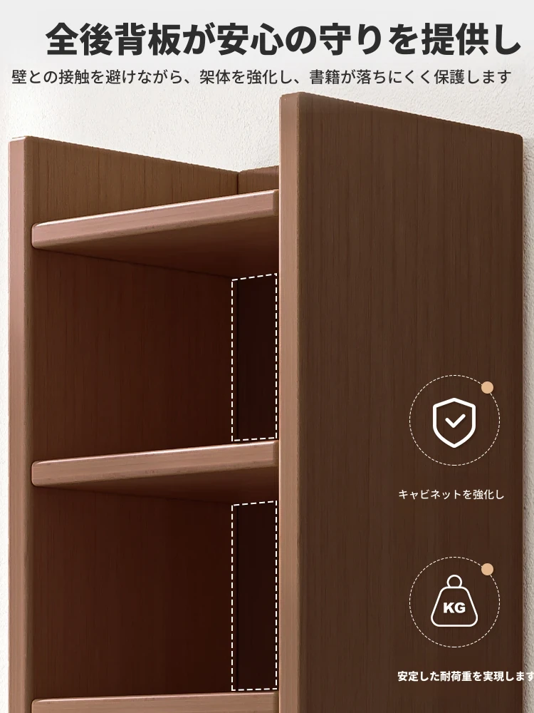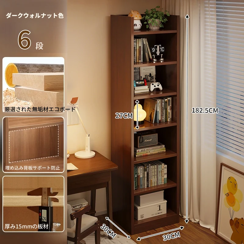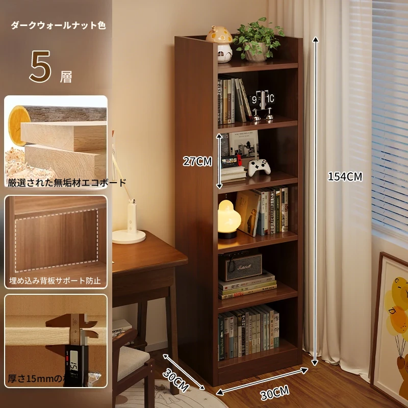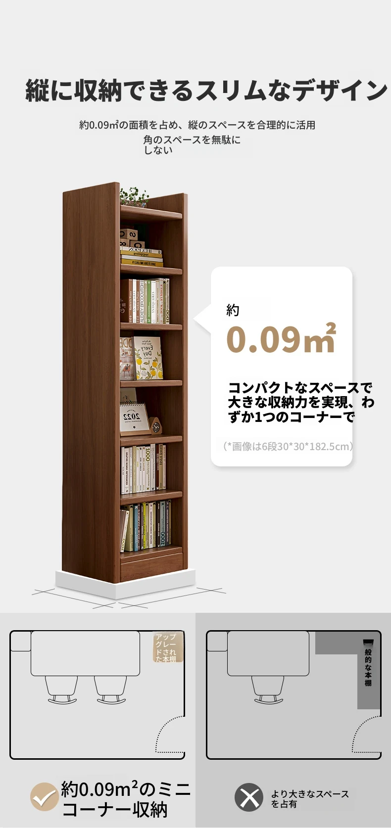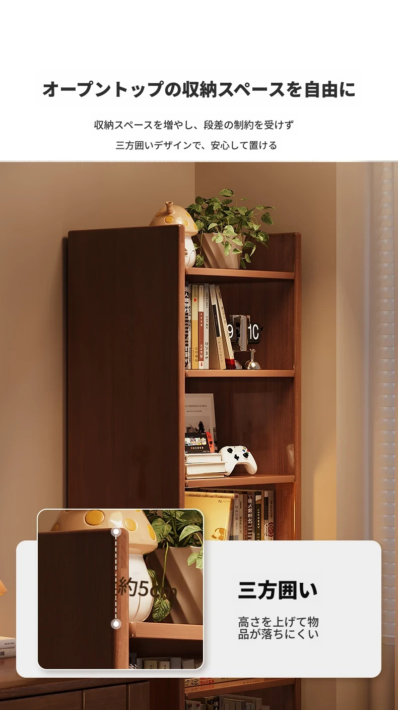 ウォールナット色の無垢材書棚・収納ラック、リビングにぴったりのフロアタイプ!壁に寄せて設置できる省スペース型コーナー書庫、スタイリッシュな収納でお部屋をスッキリ整理!