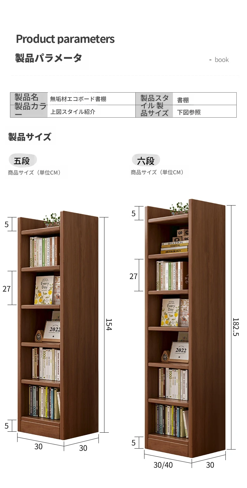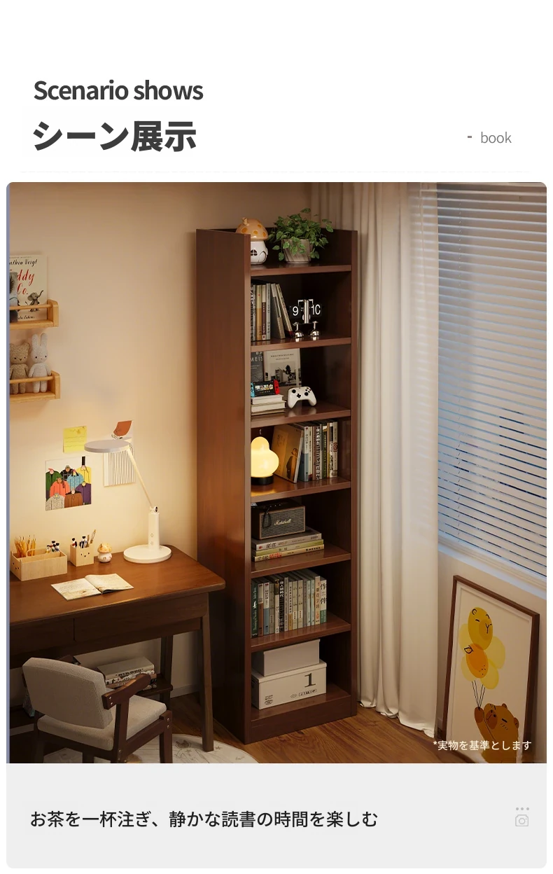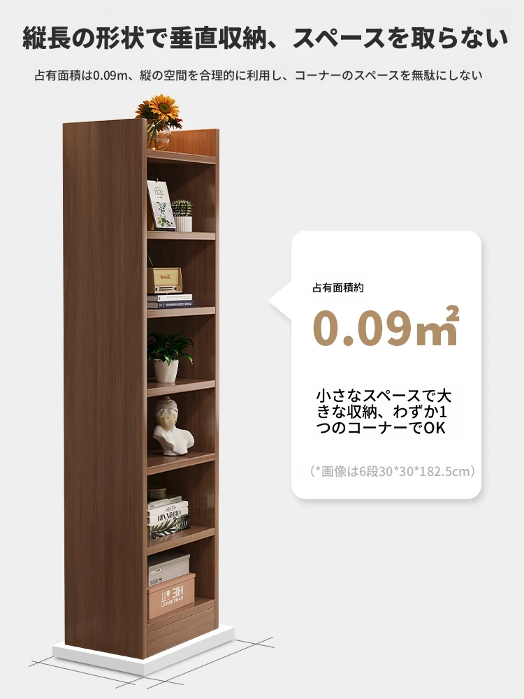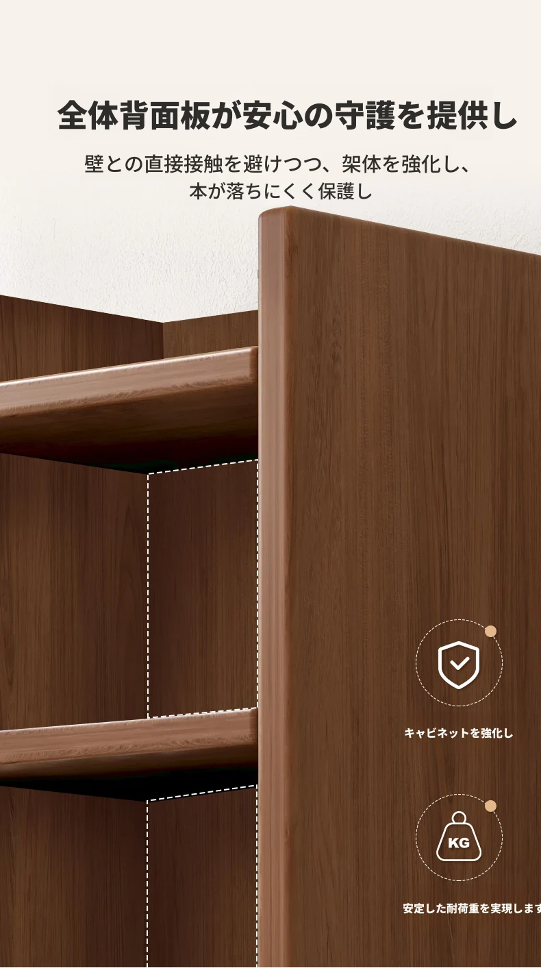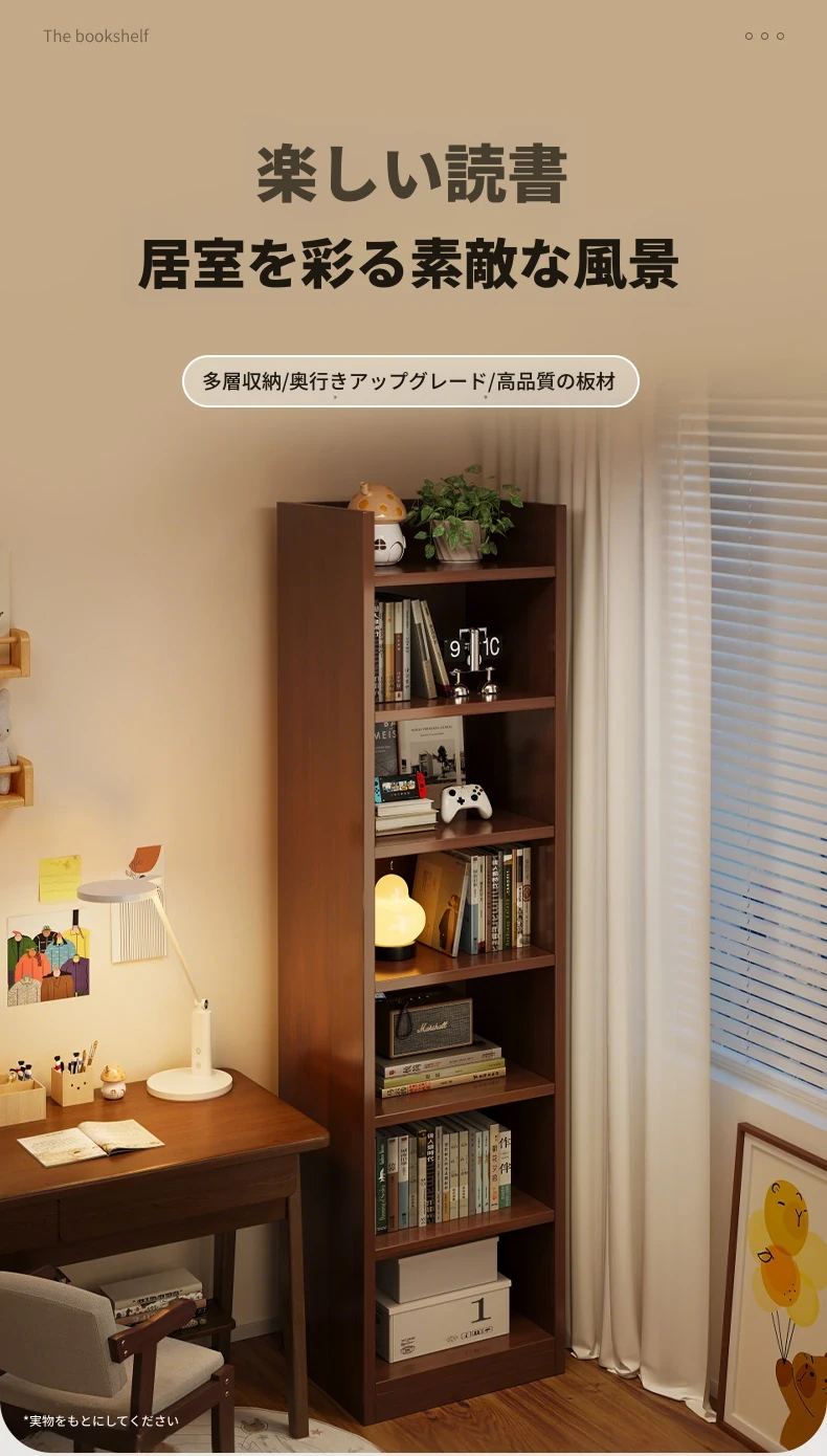 ウォールナット色の無垢材書棚・収納ラック、リビングにぴったりのフロアタイプ!壁に寄せて設置できる省スペース型コーナー書庫、スタイリッシュな収納でお部屋をスッキリ整理!
