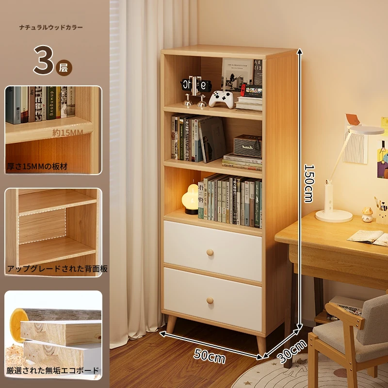 【アップグレード引き出し付き】厚さ15MMの板材⭐ナチュラルウッドパターン三層長50引き出し付き